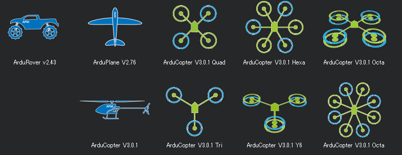 Firmware is the code running on the controller. You choose the firmware to match your vehicle and mission: Copter, Plane, Rover, Sub, or Antenna Tracker.