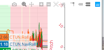 This is one of the most powerful features of the viewer. This allows you to select which log values are plotted. You can search for an individual field to plot, eg for CTUN.NavRoll you would type “Nav”) or just navigate thru to the message with that field. Here we have plotted CTUN.NavRoll, CTUN.Roll,CTUN.NavPitch, and CTUN.Pitch.The Navigation controller’s desired roll and pitch versu actual. ( For a complete list of log messages, see: Copter Log Messages , Plane Log Messages , or Rover Log Messages ).