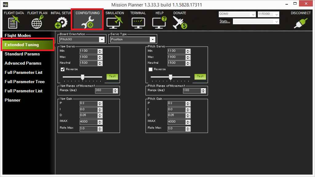 For this section it is best to plug in the battery so that the servos are powered and push the “arming switch” if present. Connect with the Mission Planner, go to the CONFIG/TUNING >> Extended Tuning page.