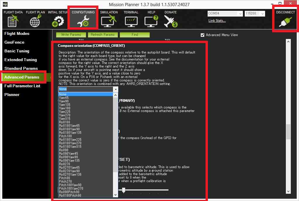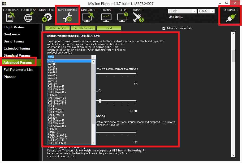 If the flight controller board could not be mounted so that its forward direction is aligned with the antenna (as mentioned on the Assembling a frame page) the AHRS_ORIENTATION parameter should be set from the Mission Planner’s Config/Tuning >> Advanced Params screen.