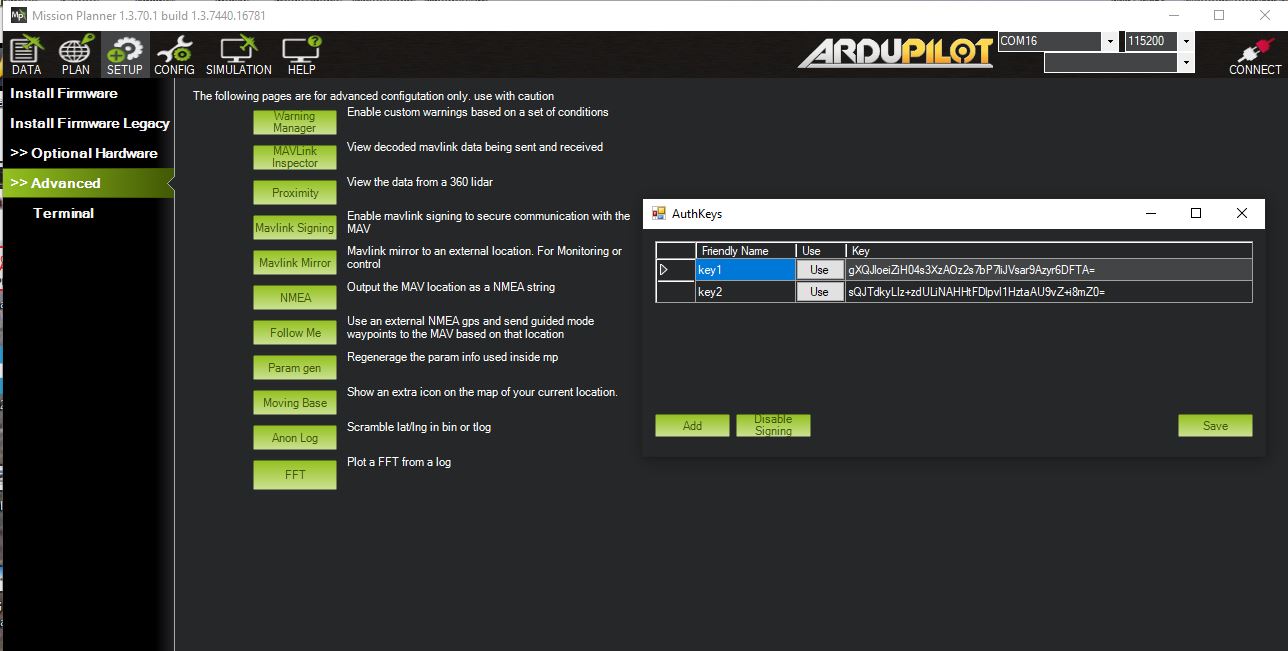 In Mission Planner, connect the autopilot, use the SETUP menu and the Advanced submenu, and press “Mavlink Signing”