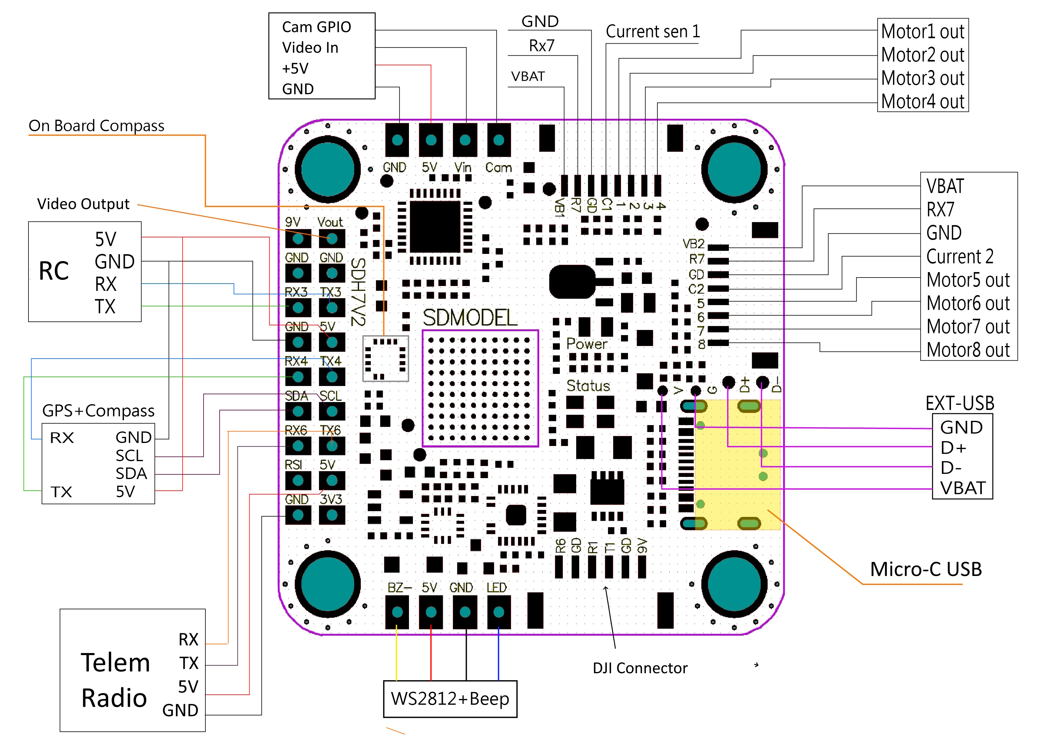 The SDMODELH7V2 supports up to 8 PWM outputs. Outputs are available via two JST-SH connectors. All 8 outputs support DShot as well as all PWM types. Ouputs 1-4 also support Bi-Directional DSHOT.