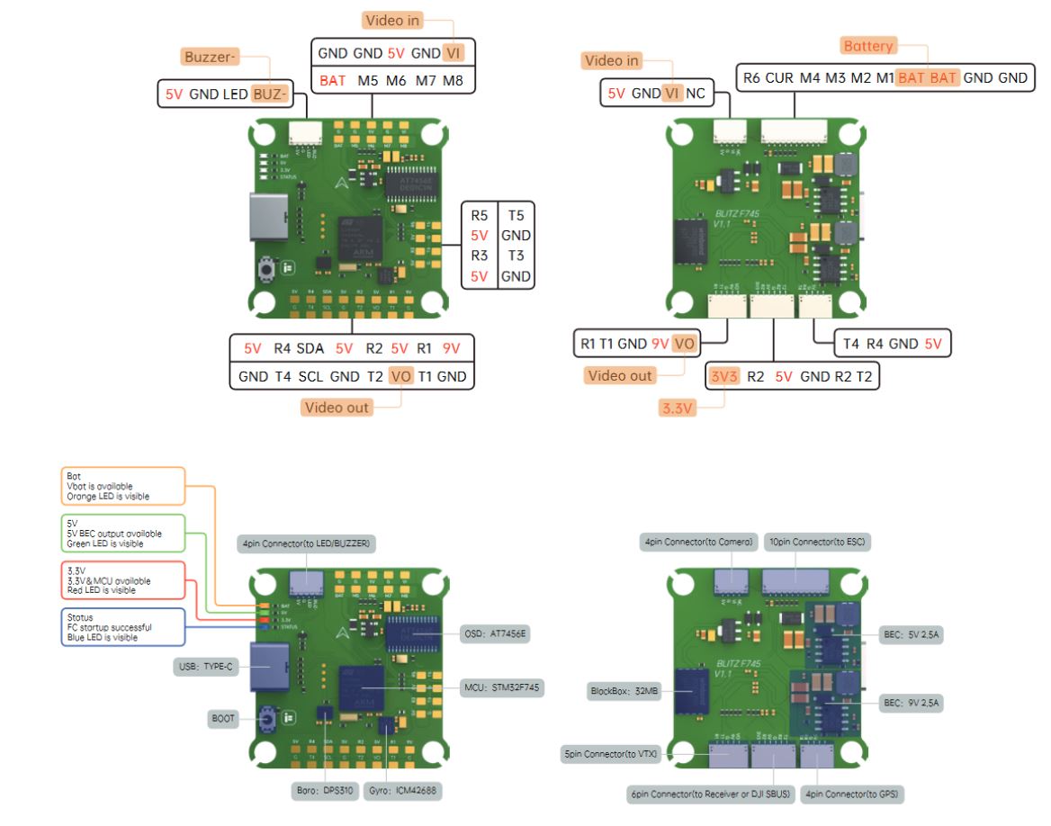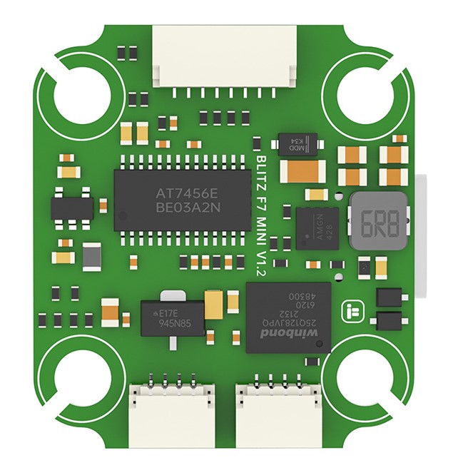 The BLITZ F745 supports up to 9 PWM outputs (PWM 9 defaults to serial LED output). Outputs 1-4 are available via a JST-SH connector, others via solder pads. All outputs support DShot, as well as all PWM types. The first 4 outputs support bi-directional DShot also.