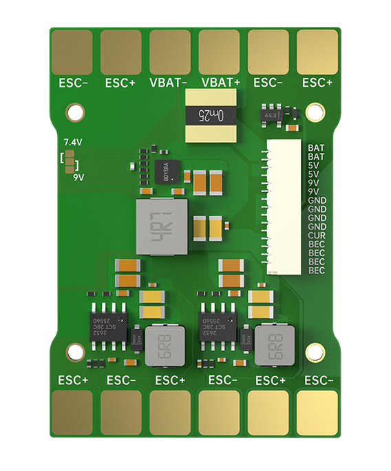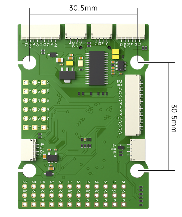The board has a built-in voltage sensor and current sensor. The voltage sensor can handle up to 8S LiPo batteries.