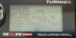 2. Navigate to Model Setup menu, then select Protocol. Ensure that you have Proto set to XJT, and Type set to D16.