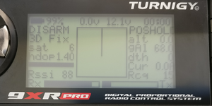 At this point, you should be receiving extended telemetry on your 9XR Pro. If you navigate to the telemetry home screen (use the up/down arrows to switch between screens) you should see standard FrSky telemetry values (such as RSSI, receiver voltage, etc) as well as extended telemetry, such as flight mode, current measurements, GPS information, etc.