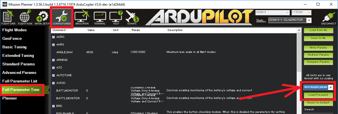If you are using a Kospi1 you may wish to load the default parameter file found here or if you are using the Mission Planner it can be conveniently loaded from the Config/Tuning >> Full Parameter Tree screen. Select “Holybro-kospi1.param” from the drop-down and then push the “Load Presaved” button.