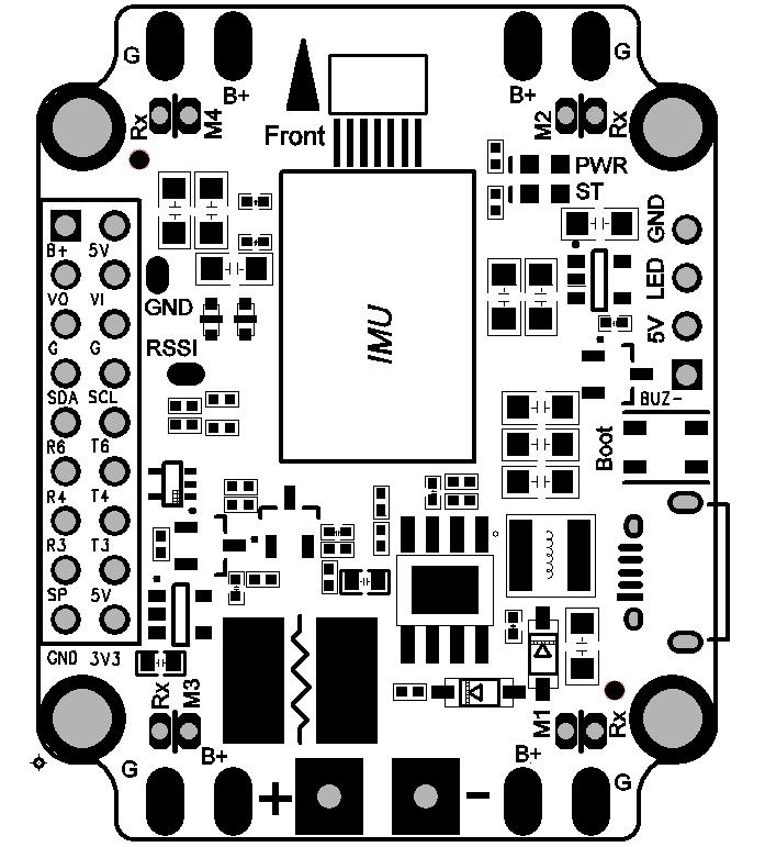 The pin labeled Rx on each corner of the board is a common pin for ESC telemetry input.