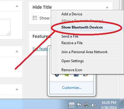 The “hidden icons box” should appear. Right-mouse-button-click on the BlueTooth icon and select “show Bluetooth devices”