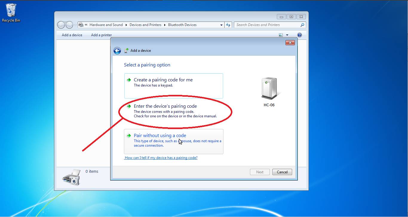 Windows will search for BT devices for you. If you have any BT devices turned on they will show up here (like perhaps your cell phone) ignore any other devices and select the HC-05 or HC-06 (or Linvor) .