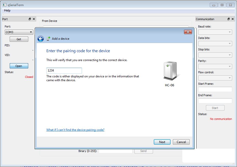 Power the vehicle and the “HC-06” device should appear. Click on it and enter “1234” or “0000” as the PIN to pair with the device, then select OK.