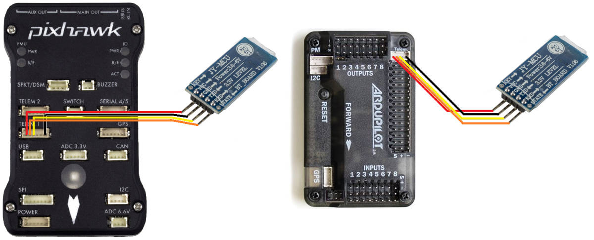 ` A Bluetooth Data Link , such as an HC-06 module can be used to connect your Pixhawk (or other controller) to your Bluetooth enabled PC or Android Ground station at distances up to 50m.