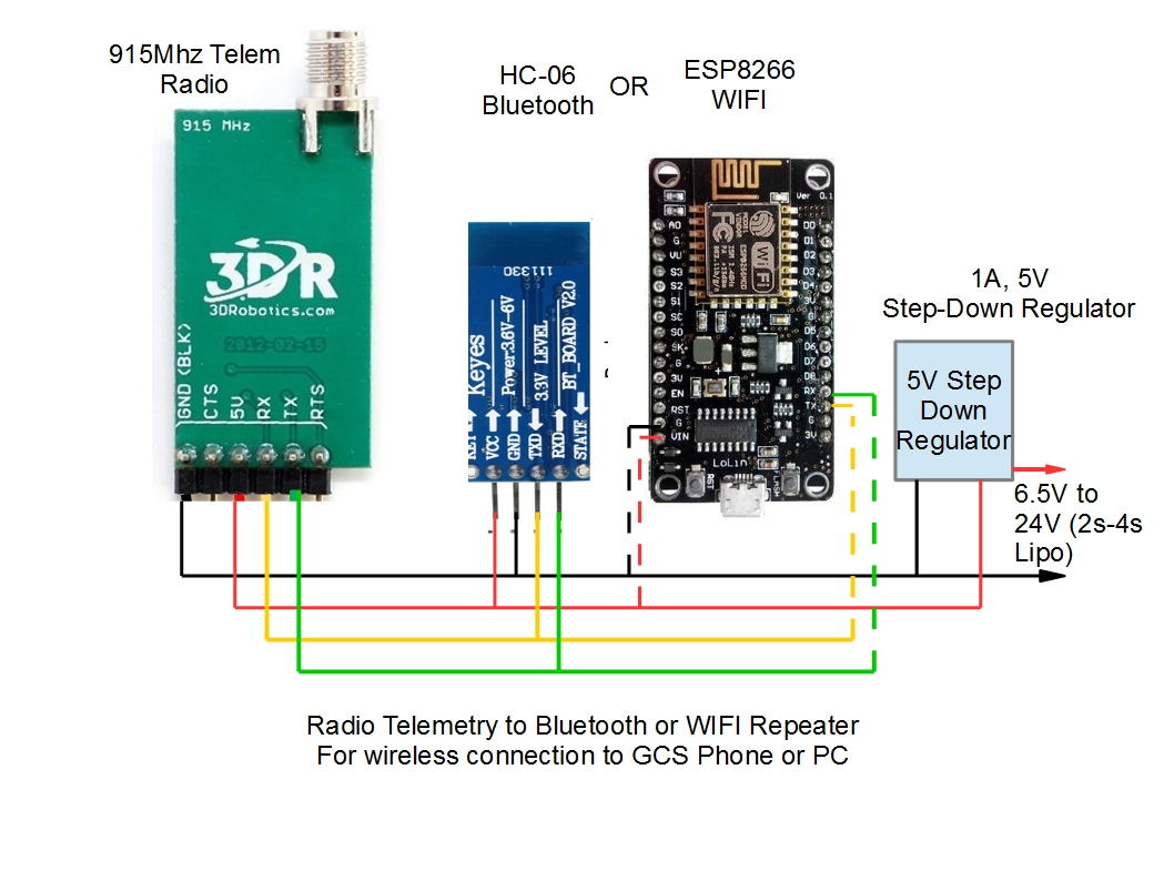 When using radio telemetry with ArduPilot, rather than attaching the telemetry receiver with a USB cable to the PC or Phone running the Ground Control Station (GCS) software, it is often more convenient to use a wireless repeater. This repeater will convert the telemetry radio receiver’s output to either Bluetooth or WIFI for wireless connection to the GCS. In the case of a phone based GCS, it allows full freedom to move around while flying or driving the vehicle. And in the case where a directional receiving antenna is used, it allows the telemetry receiver to be placed high up, away from the GCS for optimum reception.