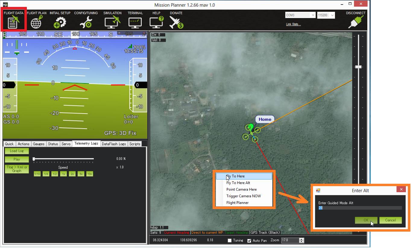 In the Mission Planner Flight Data screen map, try right-clicking on a nearby spot and select “Fly to Here”.