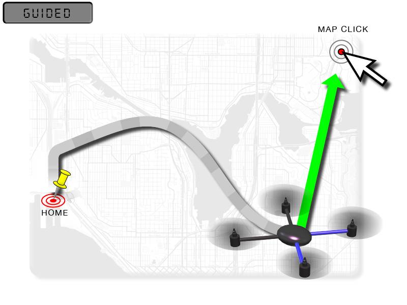 Guided mode is not a traditional flight mode that would be assigned to a mode switch like other flight modes. The guided mode capability is enabled using a ground station application (such as Mission Planner) and a telemetry radio. This capability allows the pilot to interactively command the copter to travel to a target location by clicking on a point on the Mission Planner Flight Data map. Once the location is reached, the copter will hover at that location, waiting for the next target. Follow Me mode also uses Guided Mode to make the copter follow the pilot around the field.