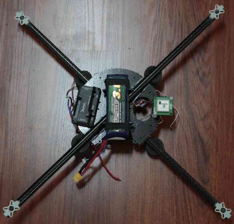 A third frame plate under the two frame tube sandwiching plates can accommodate the batteries, ESCs and Receiver.