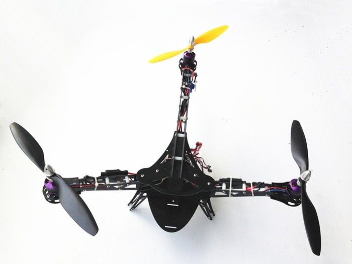 The Tricopter uses 3 motor / propeller propulsion units with a servo to rotate one of them to compensate for adverse yaw.