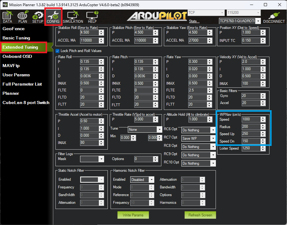 Commonly adjusted settings are listed below. Most of these can be adjusted from the Mission Planner’s Config, Extended Tuning screen (see above).
