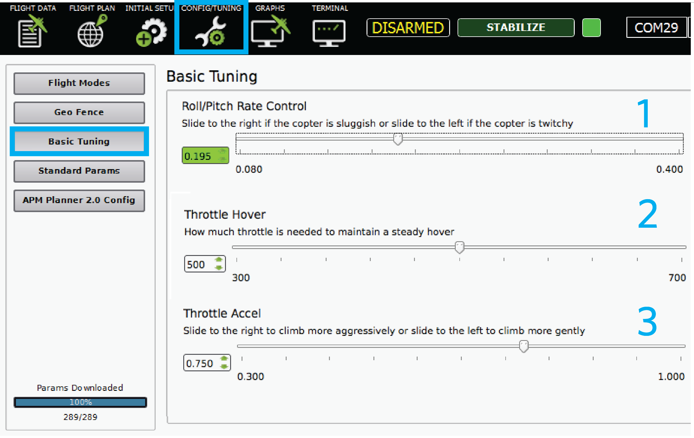 After your first flight, you may notice that you copter doesn’t respond to control inputs the way you want it to or you may have trouble maintaining control of your copter. If you are familiar with PID controllers, check out the advanced tuning guide here. If you are an experienced operator, try out the autotune feature. This page will cover the basic tuning section of Mission Planner and APM Planner that simplified the complex tuning process into a few simple sliders. This is the best tuning method for new operators.