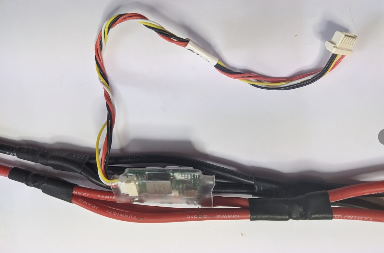 The battery is connected to the power module’s male connector. The ESC or Power Distribution Board should be connected to the power module’s female connector.