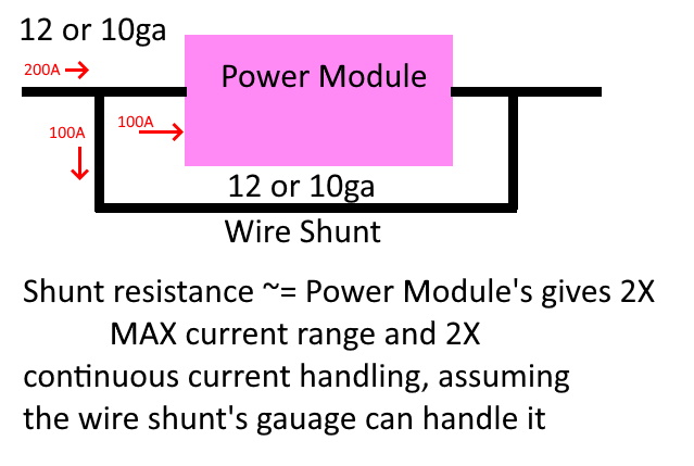 • The shunt should be approximately the same resistance as the power module. For example, a 120A module usually uses a 0.5 milliohm sense resistor. Therefore the wire shunt should be ~ 0.5 milliohm for equal sharing of the total current. This can be determined from a reference such as this . For 12ga wire, that would be ~ 4 inches.