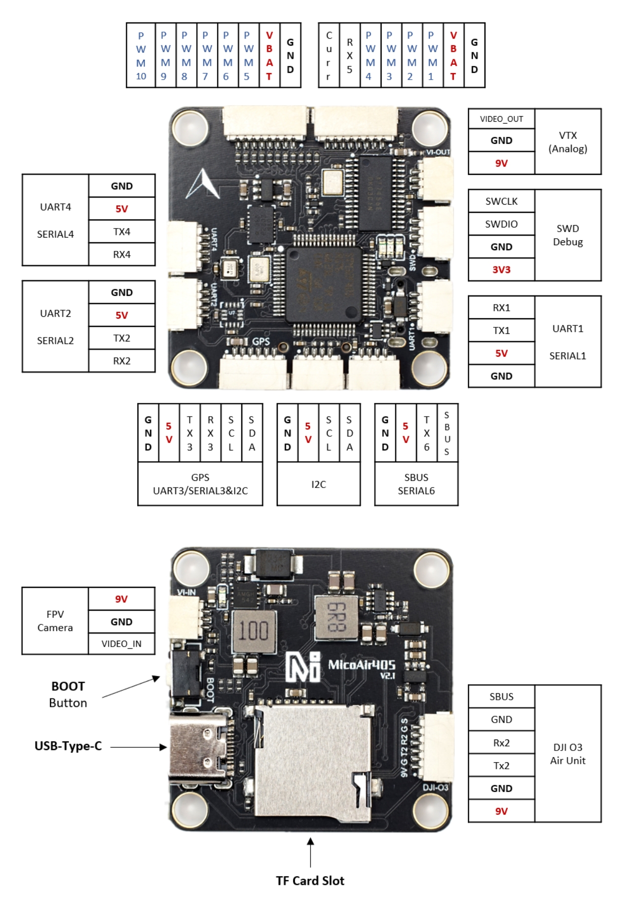 The SH1.0-6P connector supports a standard DJI HD VTX connection. Pin 1 of the connector is 9v so be careful not to connect this to a peripheral requiring 5v.