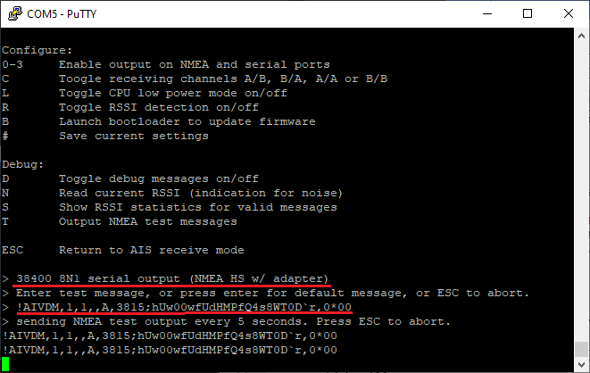 • Type “T” to enable entering a test NMEA message and then copy-paste this message, “!AIVDM,1,1,,A,3815;hUw00wfUdHMPfQ4s8WT0D`r,0*00”, or hit “Enter” and use the default location