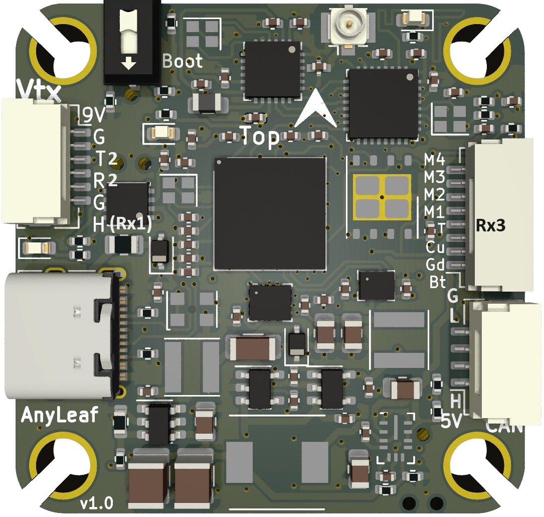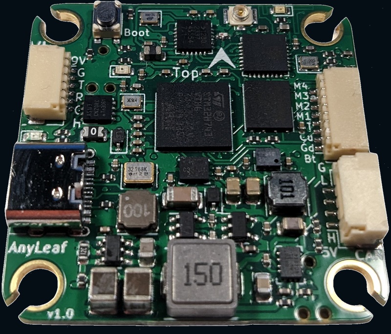 Initial firmware load can be done with DFU by plugging in USB with the boot button pressed. Then you should load the “AnyleafH7_with_bl.hex” firmware, using your favourite DFU loading tool.