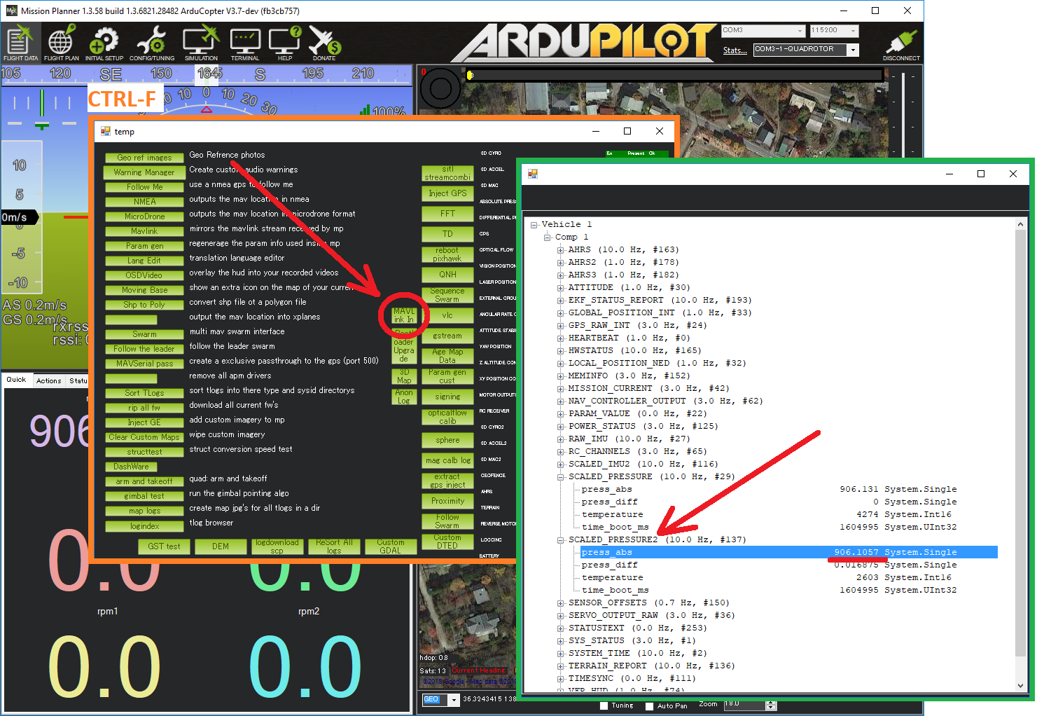 Mission Planner’s MAVLink Inspector can also be used to view the data. From the Flight Data screen press Ctrl-F, then push the “MAVLink In” button and then expand the view and look for SCALED_PRESSURE2.