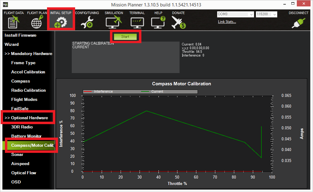 Open the Initial Setup | Optional Hardware | Compass/Motor Calib screen