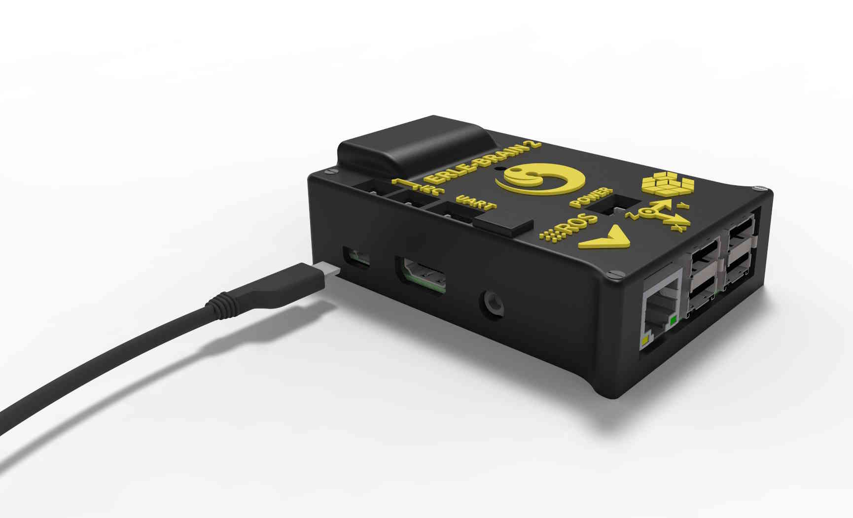 Erle-Brain2 is typically powered via its “power” port, as shown in the picture below. The power port simultaneously powers Erle-Brain2 and reads voltage and current analog measurements.
