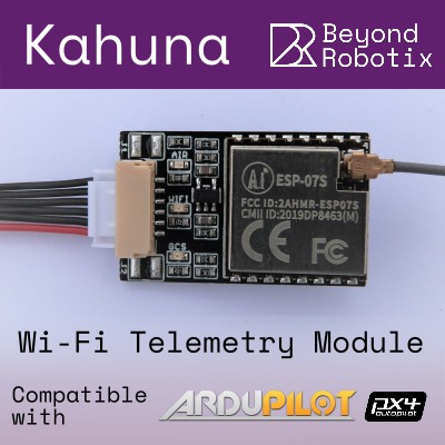 The Beyond Robotix - Kahuna is a ready to use ESP8266 module that connects directly to an autopilot. The Kahuna is pre-flashed with a fork of ArduPilot firmware, has a JST-GH connector to connect easily to several off-the-shelf autopilots and has a u.fl connector for an external antenna. Further documentation for this unit is found here.
