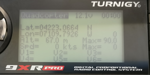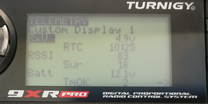 At this point, you should be receiving extended telemetry on your 9XR Pro. If you navigate to the telemetry home screen (use the up/down arrows to switch between screens) you should see standard FrSky telemetry values (such as RSSI, receiver voltage, etc) as well as extended telemetry, such as flight mode, current measurements, GPS information, etc.
