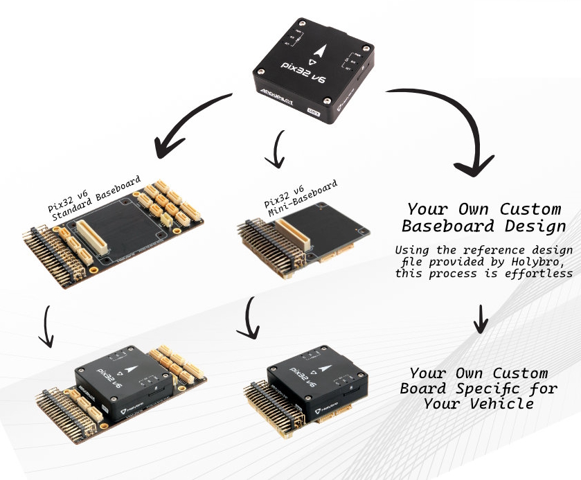 Pix32v6 is a variant of the Holybro Pixhawk 6C. It is comprised of a separate flight controller and carrier board which are connected by a 100 pin connector. It is designed for those pilots who need a high power, flexible and customizable flight control system.