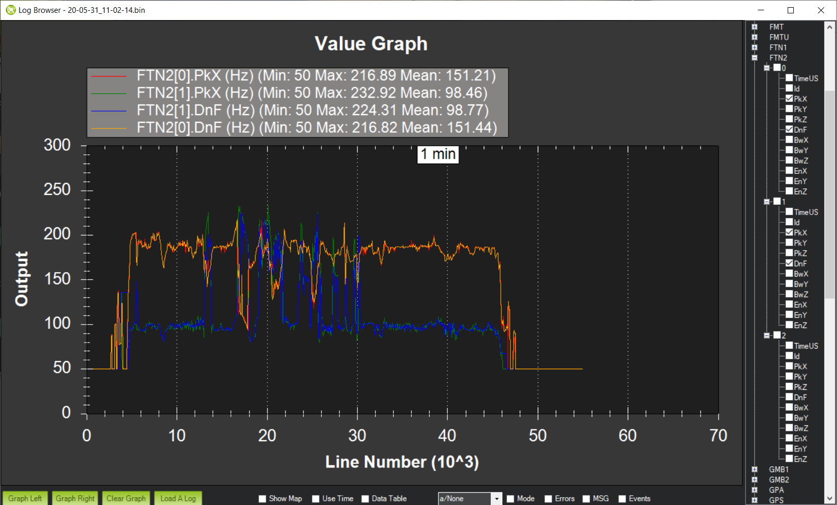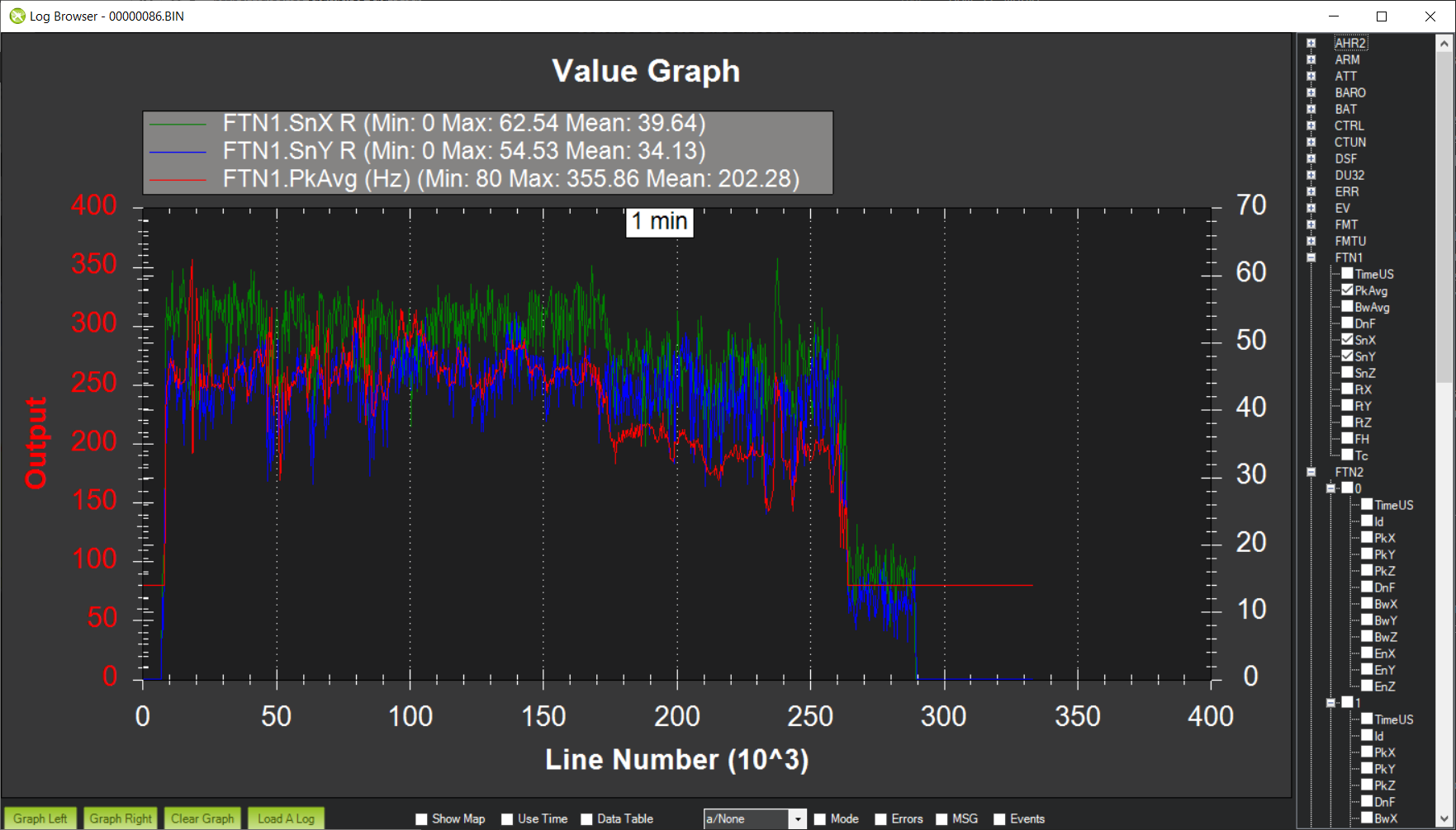 FTN1.SnX, FTN1.SnY and FTN1.SnZ give an indication of the signal-to-noise ratio of the detected frequency. This value should be above FFT_SNR_REF. For the example flight in Initial Flight and Post-Flight Analysis the SNR was about 58dB.