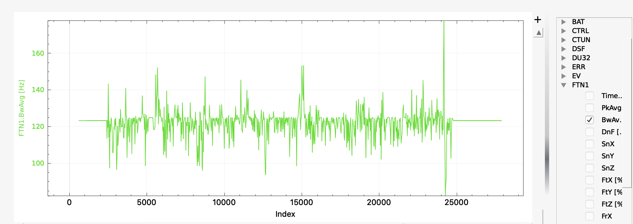 A component of the harmonic notch is the bandwidth of the notch and the in-flight FFT can be used to determine this. Download a log from a stable hover and graph FTN1.BwAvg. This is the FFT’s energy-weighted estimate of the bandwidth of the noise peak. Here is a graph from the same flight above: