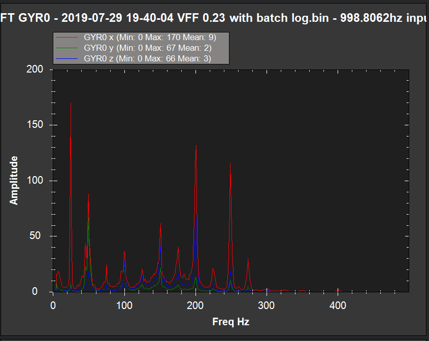 Perform the Determination of Noise Frequencies analysis explained in the Throttle based setup section. From the FFT you should see spikes at the frequency of your rotor speed in Hz (RPM/60) and harmonics of that frequency. In the image below, the rotor speed is 25hz. Note that the next two biggest spikes occur at 50 Hz and 100 Hz.