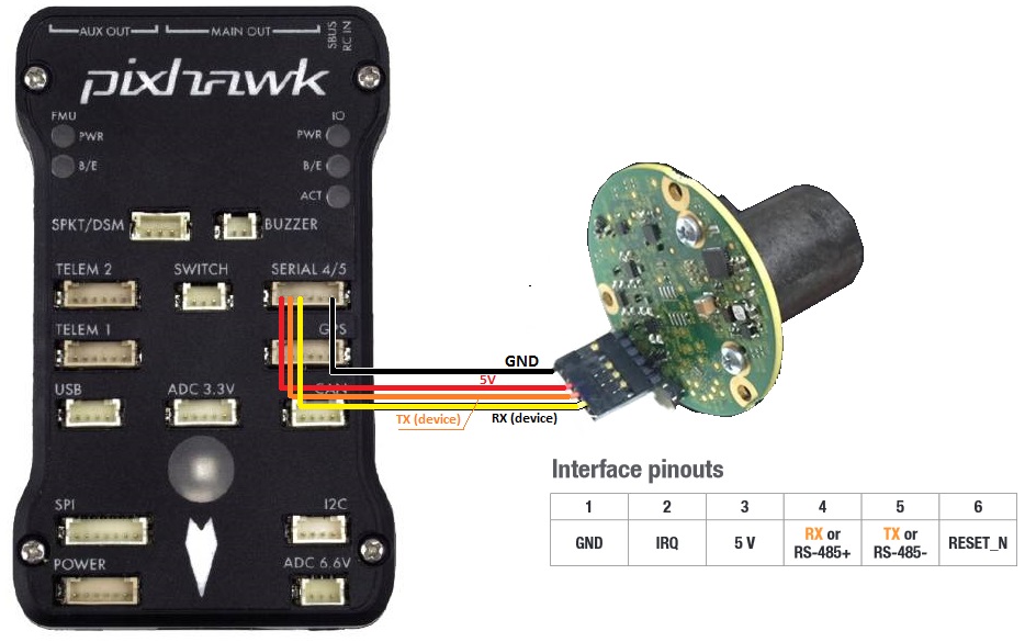 The sensor’s serial connection can be connected to any spare serial port (i.e. Telem1, Teleme2, Serial4) on the autopilot. Connect the lidar’s RX line to the autopilot’s UART TX line, the lidar’s TX line to the UART’s RX then also connect the GND and 5V lines. The image below shows how the sensor output pins can be connected to a Pixhawk’s Serial4 port.