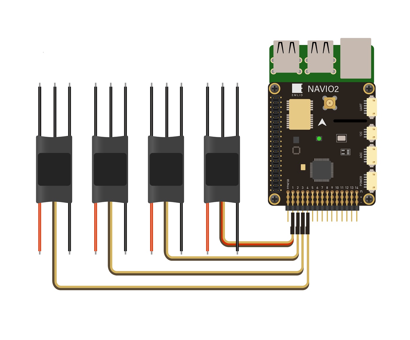 For typical ESCs setup schemes visit NAVIO2 documentation which includes copter, plane, rover setups.