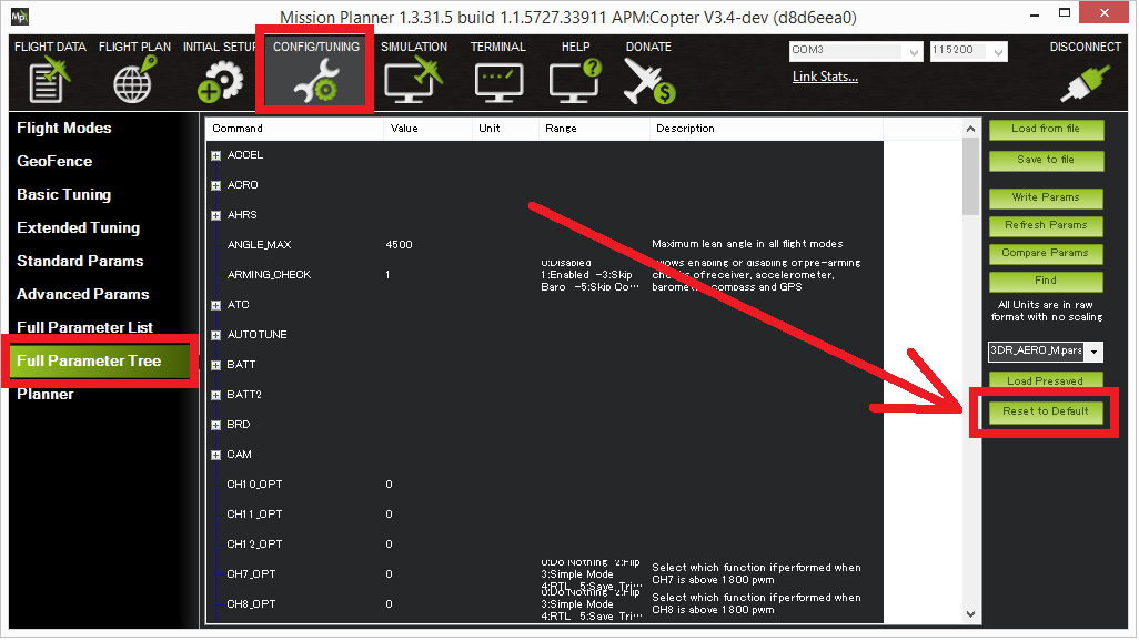 Connect the autopilot to Mission Planner, and on the CONFIG | Full Parameter List or Full Parameter Tree page push the Reset to Default button.