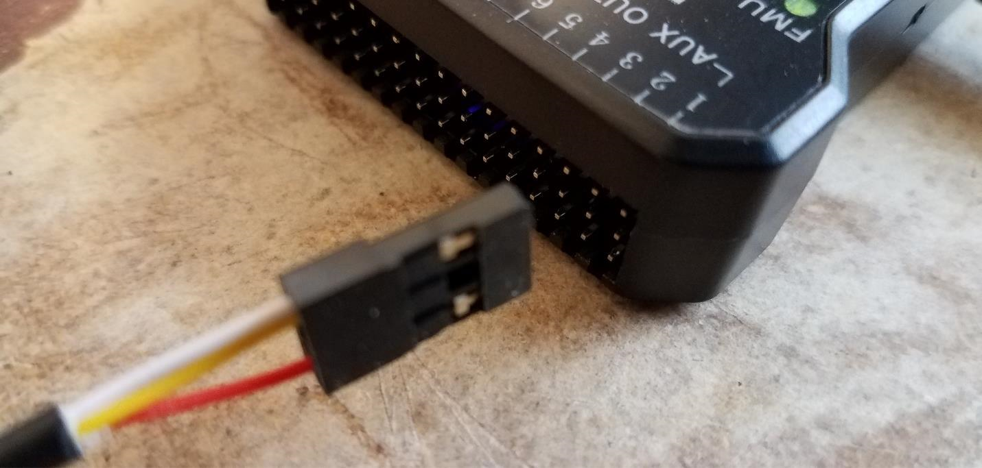 The cable is now ready for connection to your Pixhawk Controller. Note that the Shutter Pin (in this case the RED wire) will be on the SIGNAL side of the Auxiliary port while the WHITE/YELLOW wire will be on the GROUND side of the Auxiliary port.