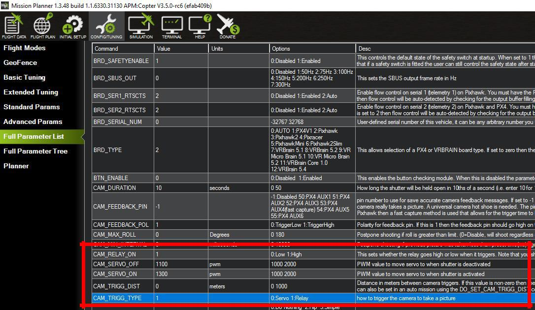 1. Navigate to the FULL PARAMETER LIST under the main CONFIG/TUNING tab and locate the CAMx_TRIGG_TYPE parameter. This parameter must show as 1 for “RELAY”. If it is not set to 1, change this parameter to 1 before proceeding to the next step.