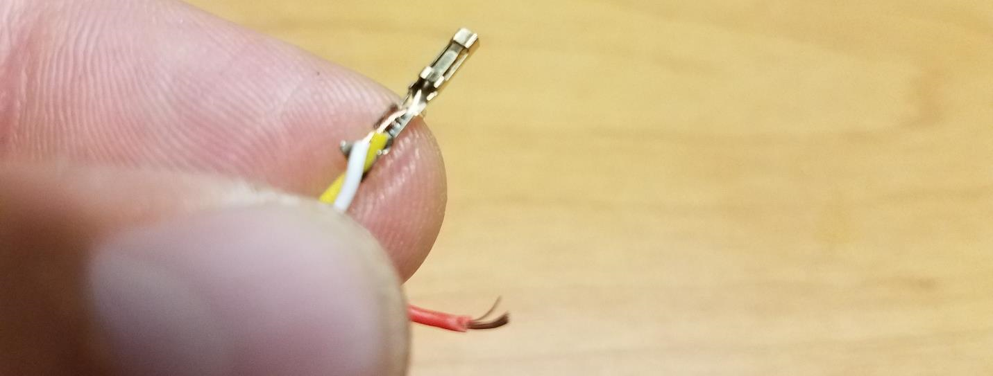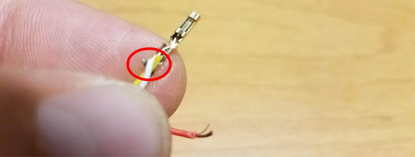 TIP: The Servo Pin has two sets of tabs which after crimping will fold on each other and secure the wire. To make life a little easier, use a small pair of needle nose pliers to press the pair of tabs on the end of the servo pin tightly against the wires. This will prevent the wires from coming out of the servo pin while trying to crimp them.