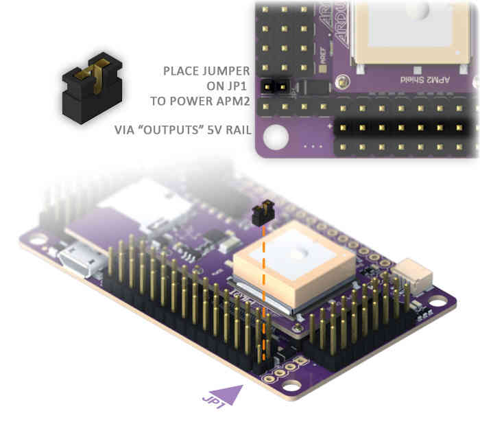 It’s also possible to power APM 2.5 from two separate sources, one powering the RC system on the input side, and the other powering the output side (servos or ESCs). This is determined by a jumper on the JP1 pins (see below). If the jumper is on, which is the factory default, the board is powered from the OUTPUT rail or the USB. If the jumper is off, the board is powered from the INPUT rail, but the OUTPUT rail will need its own power source. This configuration is used if you want to have two separate power sources in your aircraft, one powering the servos and the other powering the electronics. The ideal input voltage is 5.37v +/-0.0v and may not be provided by a typical ESC.