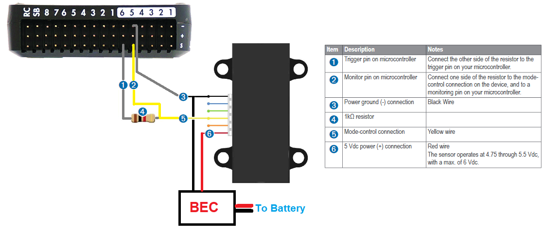 The power to the rangefinder should be supplied from a separate external BEC as shown in the diagram below.