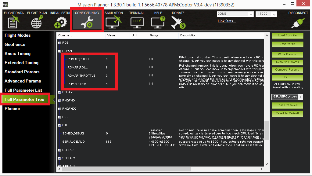 These can be changed by setting the RCMAP_ROLL, RCMAP_PITCH, RCMAP_THROTTLE and RCMAP_YAW parameters using the Mission Planner’s Config/Tuning | Full Parameter Tree (or Full Parameter List) as shown below.