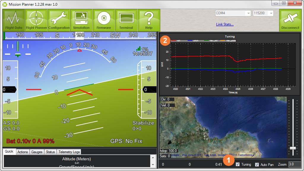 You can see the output from all the various sensors by clicking on the Tuning checkbox on the bottom right of the display ** 1 ** This will bring up the graphical sensor display.