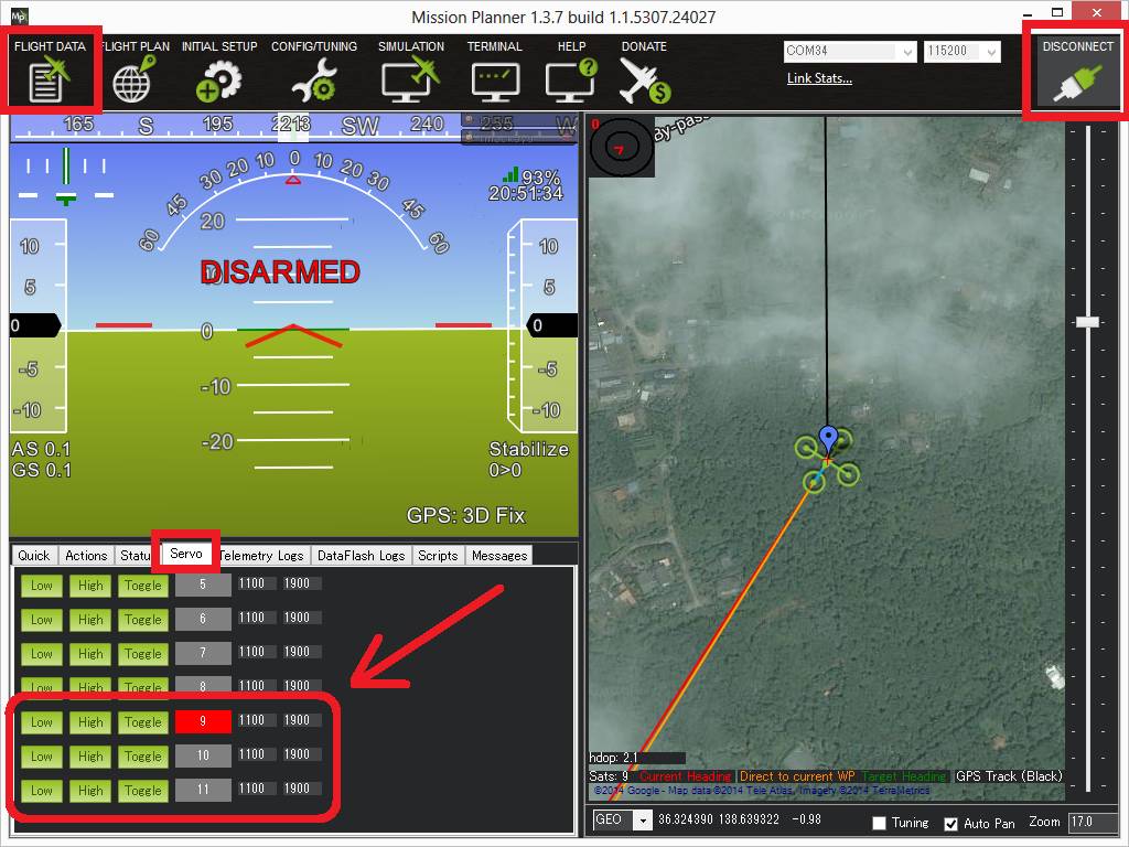 Create the mission you wish to fly and add a DO_SET_SERVO command and include the servo number (i.e. “10”) in the “Ser No” field and the PWM value (usually between 1000 ~ 2000) in the “PWM” field.