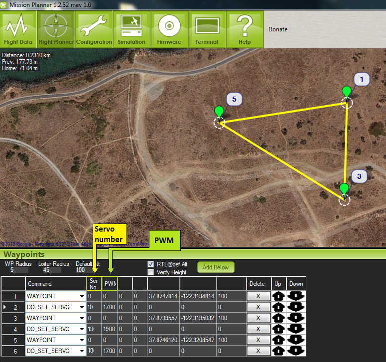 Note that the DO_SET_SERVO command is a “do command” meaning that it can only be run between waypoints so it must not be the first or last command in the mission. It will be executed immediately after the waypoint that precedes it.