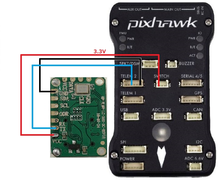 Connect the sensor’s GND and TX pin to one of the autopilot’s serial ports. Note that the TX pin of the sensor should be connected to the RX pin of the autopilot. In the image above the sensor is connected to a Pixhawk’s Telem2 port.